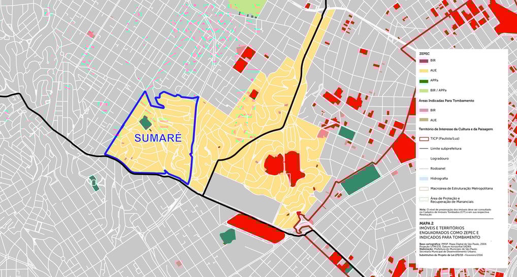 O bairro do Sumaré se enquadra dentro da ZEPEC-AUE pela Lei de Zoneamento do Plano Diretor Estratégico (PDE) - Lei nº 16.050/14, que demarca "áreas da cidade destinadas à preservação, valorização e proteção de espaços culturais, afetivos e simbólicos, de grande importância para a memória, identidade e vida cultural da cidade". Mais especificamente, "preservação de porções do território com características singulares tanto para a morfologia urbana, arquitetônica e paisagística, como cultural e simbólica, constituindo elementos representativos do processo de urbanização de determinada época."